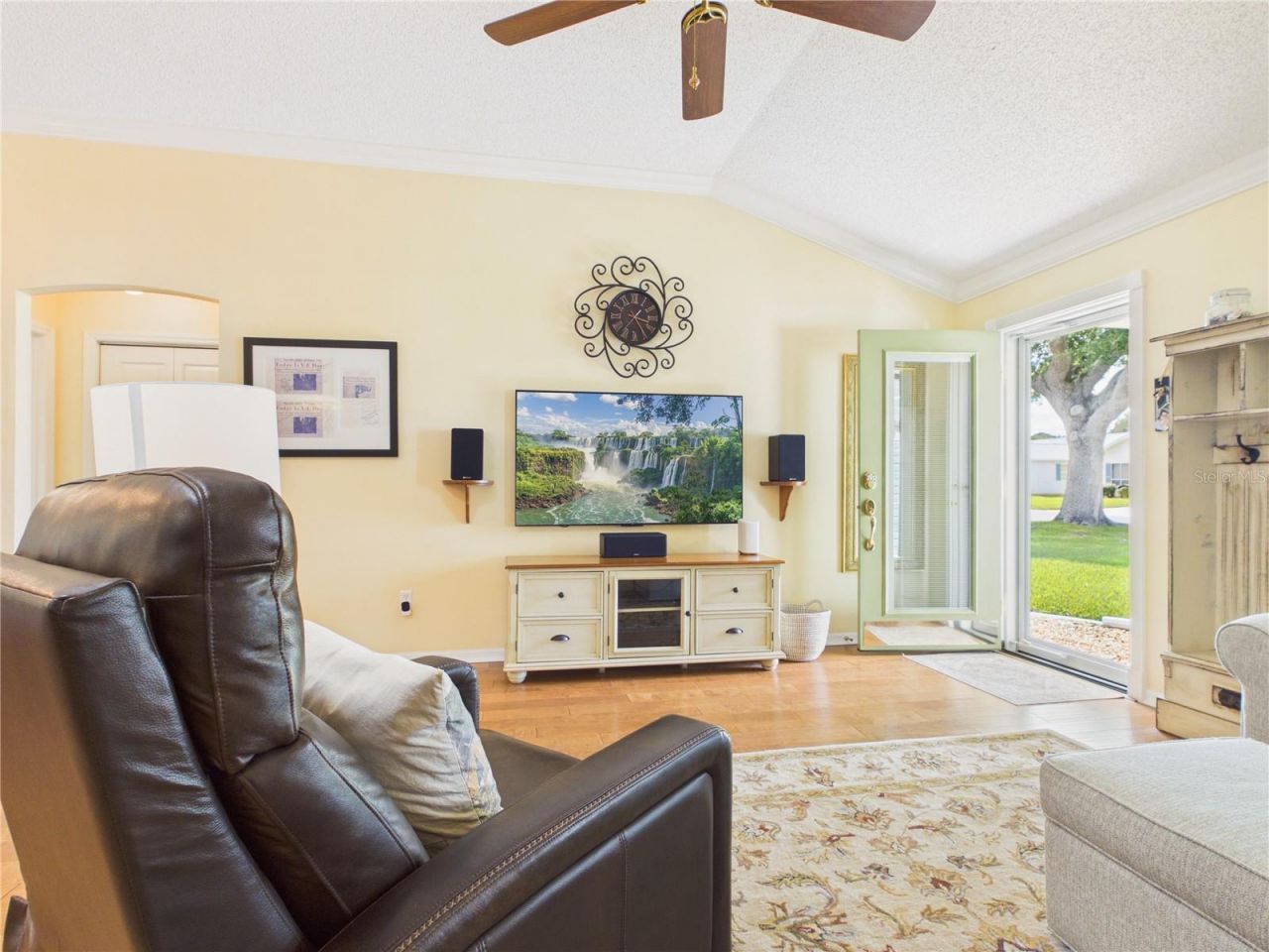 Located in the Village of Rio Grande, this beautifully maintained home features a 2-car insulated garage with A/C mini-split, commercial-grade covered flooring, privacy garage door screen and an abundance of storage. Enjoy vinyl double-pane windows and new Hunter Douglas window treatments in the living area and guest bedroom. Tile floors that look like hardwood in living area - no carpet! Kitchen and bathroom have Quartz & Granite countertops, with updated tile in all wet areas. Updated Kitchen includes a tile backsplash, soft-close drawers, cabinetry with pull-out shelves, and both over & under cabinet lighting and Stainless Steel appliances. Washer and Dryer included. Three solar tubes provide excellent natural light. Primary bedroom offers a spacious walk-in closet and updated en-suite bath with vaulted ceilings and ample storage. Guest bedroom features a queen murphy bed and custom maple cabinetry ideal for storage or dual office set up, walk-in closet has a built-in safe. Updated guest bath. Relax in glass-enclosed, heated/cooled Lanai. Living room entertainment includes surround sound (equipment included). Home is wired for SimpliSafe (buyer must activate this system). Exterior boasts stamped concrete driveway, walkway & covered front porch with convenient side garage entry. Additional upgrade steel front storm & picture-window doors. Step outside to private backyard with stamped patio complete with awnings. Spanish Springs is 0.8 miles & Lake Sumter Landing is a short golf cart ride. Great location for shopping, restaurants, and medical facilities. Roof - 2024, HVAC - 2022, Hot water Heater - 2024, Newer vinyl double pane windows - NO BOND!